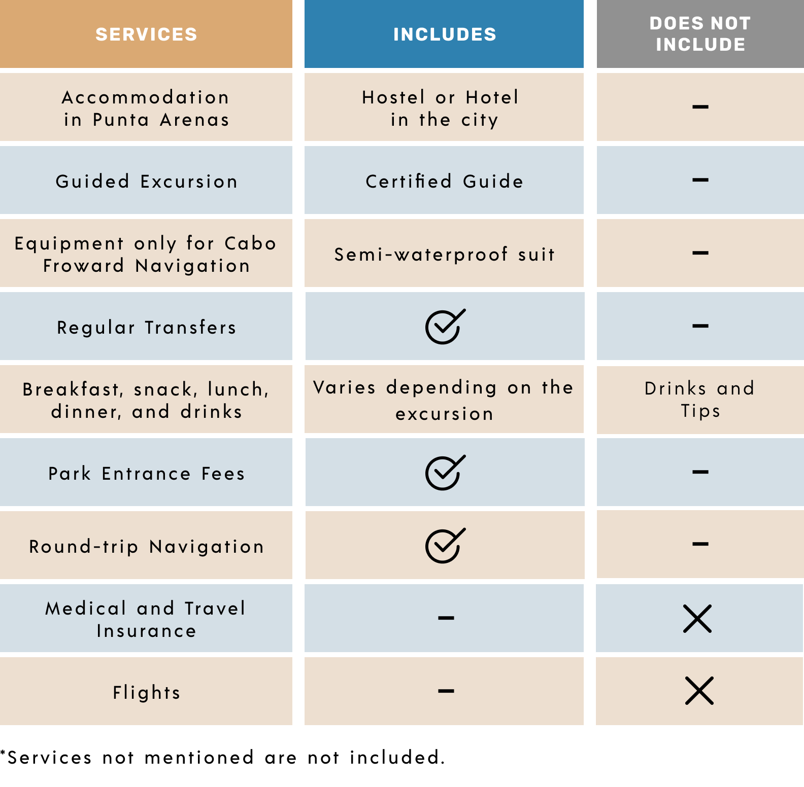 - Start of the navigation to Santa Inés Island, Whale and Glacier Sighting at 03:30 AM, checking in at the excursion office.