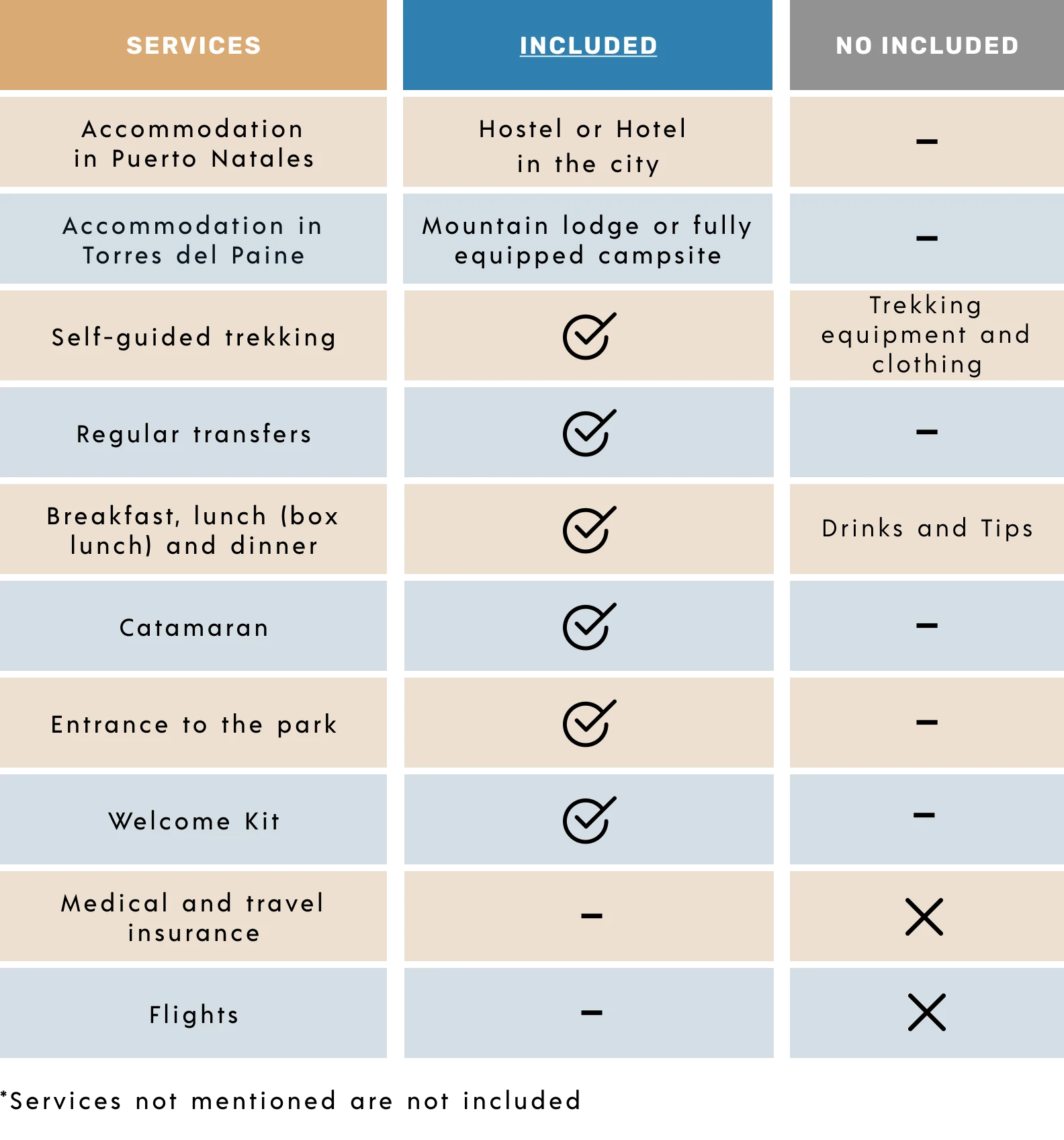- Catamaran navigation on Lake Pehoe at 6:00 PM, connection with regular bus and return to Puerto Natales.