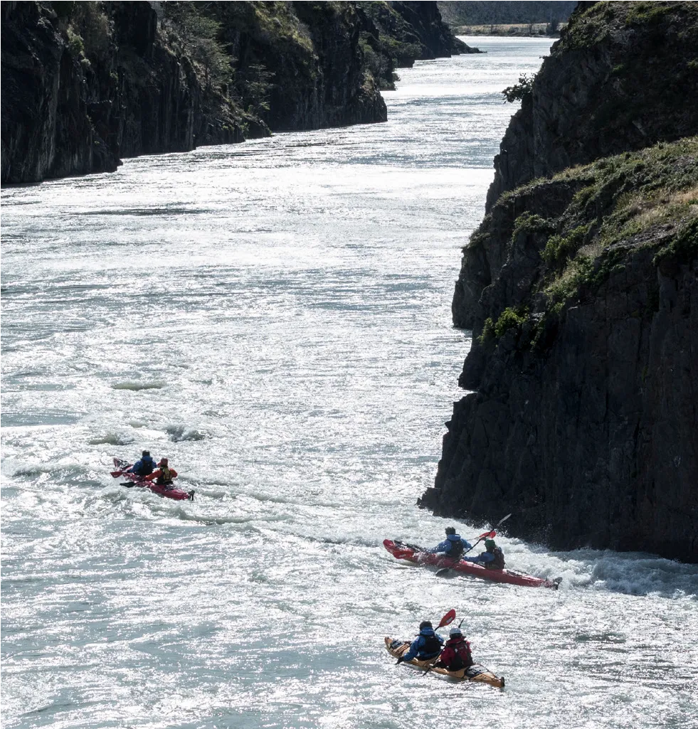 - Ruta en kayak desde Lago Grey a Villa Serrano. Duración de 4 a 5 horas, distancia de 30 km.