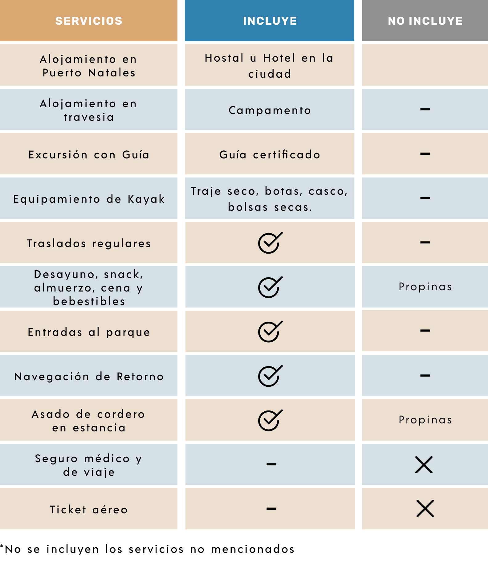 - Desayuno en camping Serrano para viajar hacia Glaciar Tyndall, duración de 5 a 6 horas, distancia de 23 km.