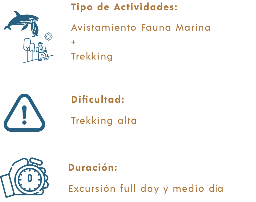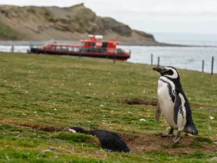 • Luego del traslado al punto de embarque, se realizará navegación en lancha rápida por 45 minutos hacia Isla Magdalena, para una caminata guiada de 1 hora con el objetivo de observar Pingüinos magallánicos en su entorno natural. Continuando la travesía hacia Isla Marta para el avistamiento de lobos marinos, cormoranes imperiales y gaviotas australes.