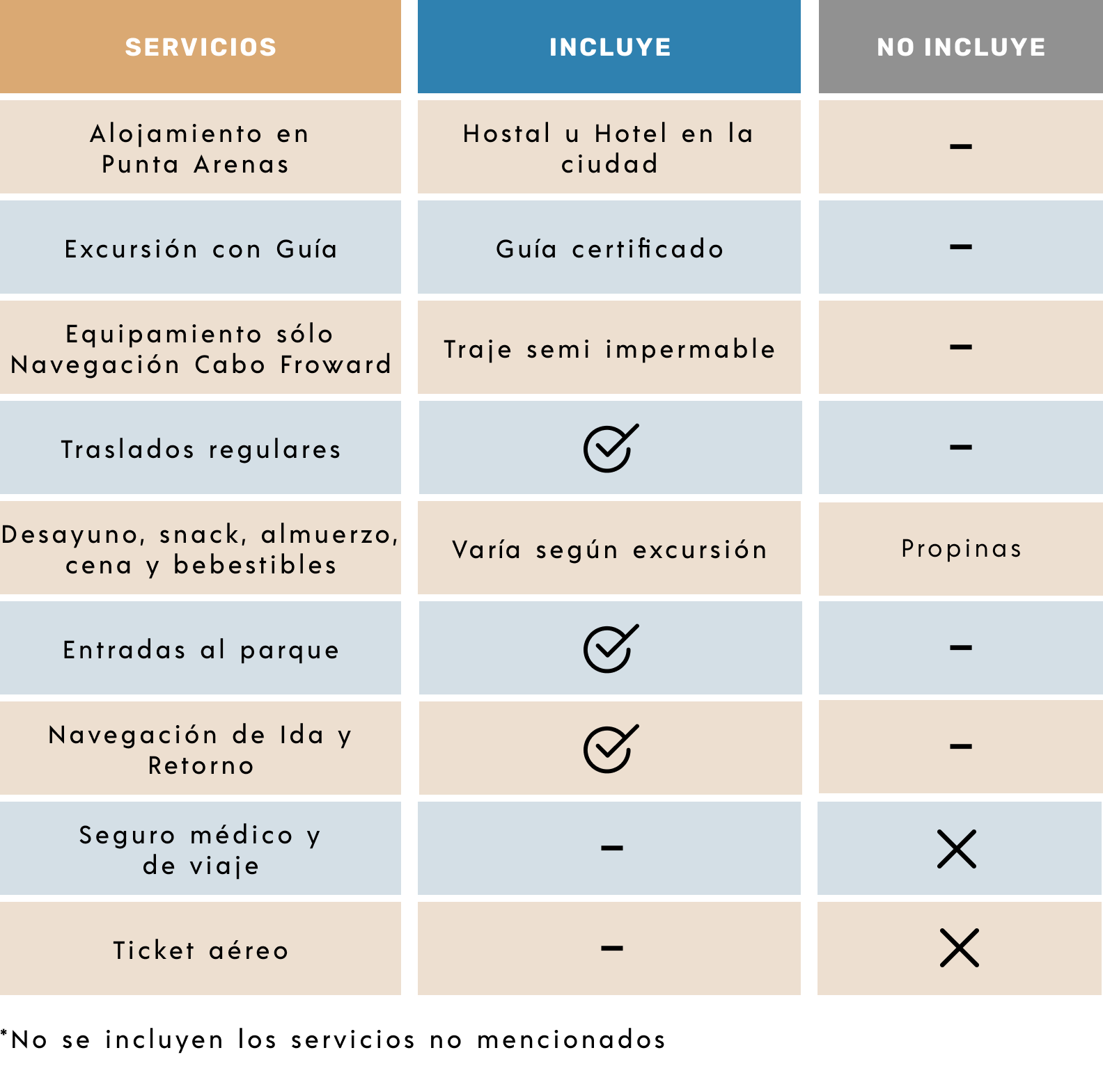 • Retorno a Punta Arenas, llegada estimada alrededor de las 18:00 horas.